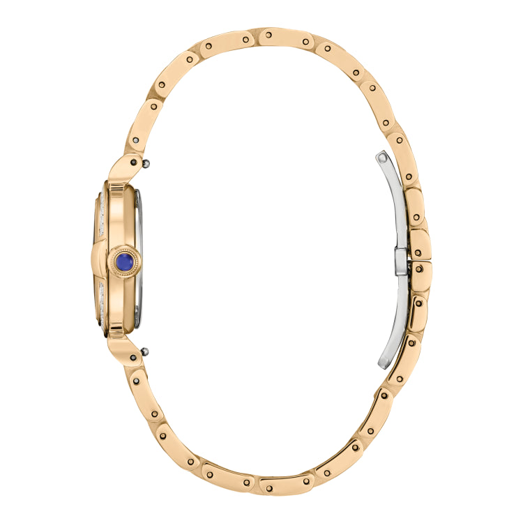 Classic lines and hints of romance make this newest timepiece to our women’s collection, the Citizen L Mae, a glamorous addition of sustainable luxury. With a 26mm case design inspired by a vintage perfume bottle and featuring the curved, sleek lines of May bells, the diamond-set bezel shape has a distinct feature at the 3 o’clock position, where the crown resembles an elegant perfume stopper. Featuring a gradient green dial made of recycled materials, including a recycled polycarbonate base under the dial, the display is showcased via a sleek, rose gold-tone stainless steel case and bracelet. The dial also has a diamond that gives focus to the 8 o’clock position and is finished with a sapphire crystal. Sustainably powered by any light with our proprietary Eco-Drive technology that never needs a battery, this elegant ladies’ watch is the perfect dressed-up look with high-powered performance. Caliber E031.