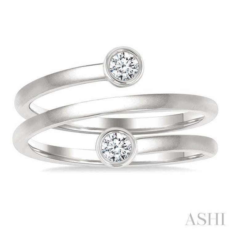 Modern minimalism meets sculptural elegance in this chic double coil fashion ring. The sleek bypass design wraps gracefully around the finger, ending in two bezel set round cut diamonds, each weighing 1/10 Ctw. The open-ended silhouette creates a sense of movement and balance, while the bezel settings lend a clean, contemporary finish. Molded in rhodium finish 14 karat white gold, this fashion-forward diamond ring brings refined sparkle to your everyday style or makes a bold standalone statement. Total diamond weight is 1/5 Ctw.